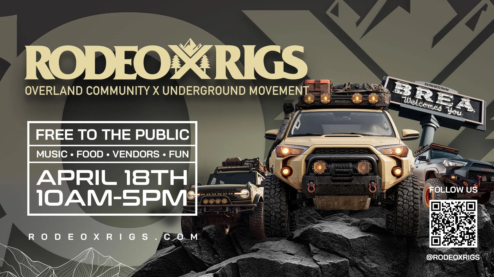 Join us April 18th as the Off-Road / Overland Community teams up with the City of Brea for an awesome showcase. A family-friendly event filled with entertainment, an eclectic mix of food, drinks, live music, vendors and a welcoming atmosphere. There will be a BMX / MTB Demos, a KIDS ZONE for the whole family to enjoy and some of the Off-Road / Overland industries top companies to fulfill your outdoor needs.